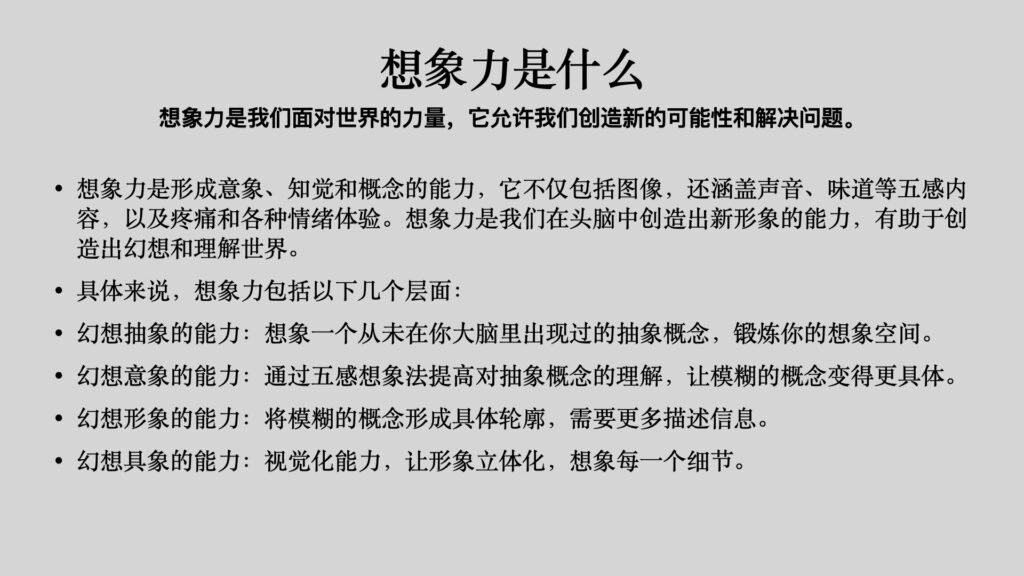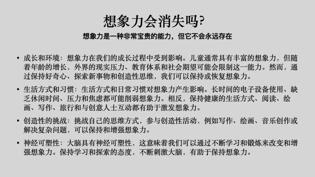 想象力是什么?它不仅仅是头脑里浮现出新图像的能力,更是将声音、味道、触觉乃至痛觉和情绪都纳入心灵表征的力量。想象力让我们看到世界之外的景象,也帮助我们在现实中理解难解的事物。从某种意义上说,每个新概念的诞生,都离不开对既有经验的重组:我们在脑海中拼接熟悉的画面和感知,才得以创造出前所未有的意象。想象力并非凭空出现,它源于记忆与感受的积累,在童年的丰富体验中茁壮成长,却往往在成长教育与社会规范的严谨逻辑面前被压抑。幸运的是,大脑具有可塑性:持续地观察、阅读和试图创造,都可以激活那条连接现实与虚构的神经通路,延续并强化想象力。想象力虽然脆弱,但绝不会自我终结。它可能在世俗喧嚣和机械的工作中暂时沉睡,但只要我们愿意停下来凝视星空、聆听故事,想象之火总能重新点燃。
