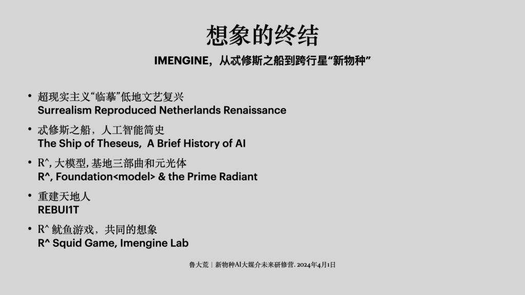 由此观之,“艺术史的终结”并非想象力的谢幕,而是想象谱系的换道与延续。当艺术不再是定义创作的唯一标签,想象力反而更得以自由重组。当AI技术重新洗牌我们的文化符号时,人类未竟的想象力旅程才刚刚启程。换言之,在这个被宣称“终结”的节点,恰是想象力创造“新物种”的开始:我们不妨以哲学的冷静注视未来,让想象在新的媒介中继续书写未完的故事。艺术史的落幕,也正意味着想象力的开篇,在无尽的虚拟与现实边界之间徐徐展开。