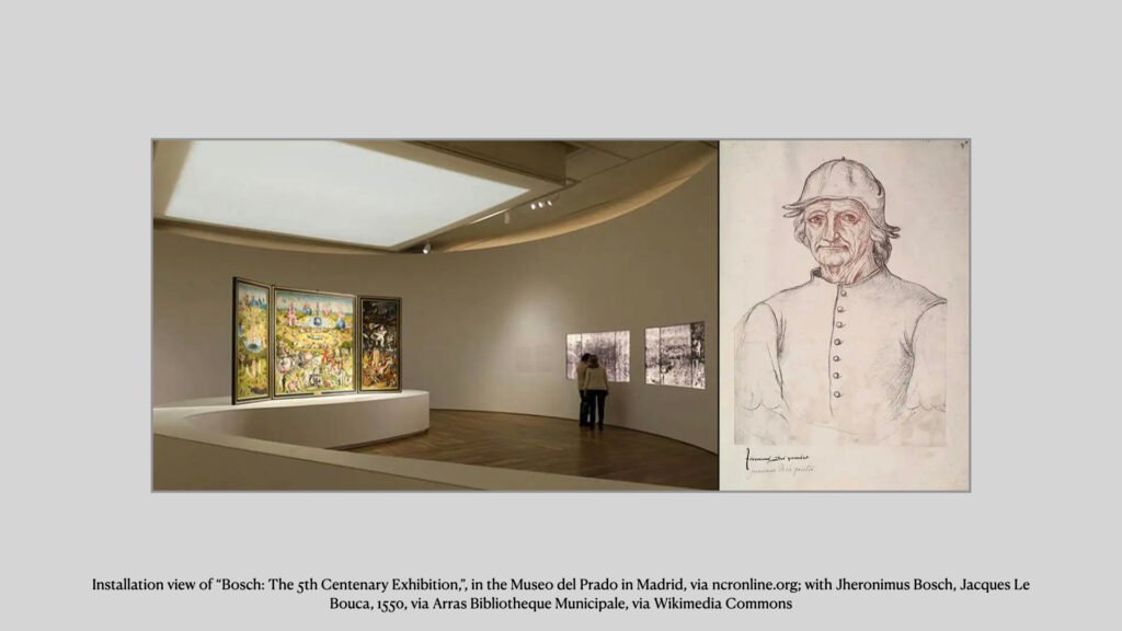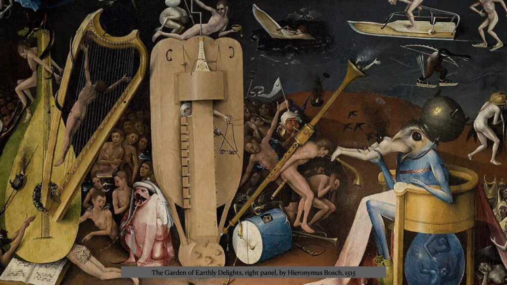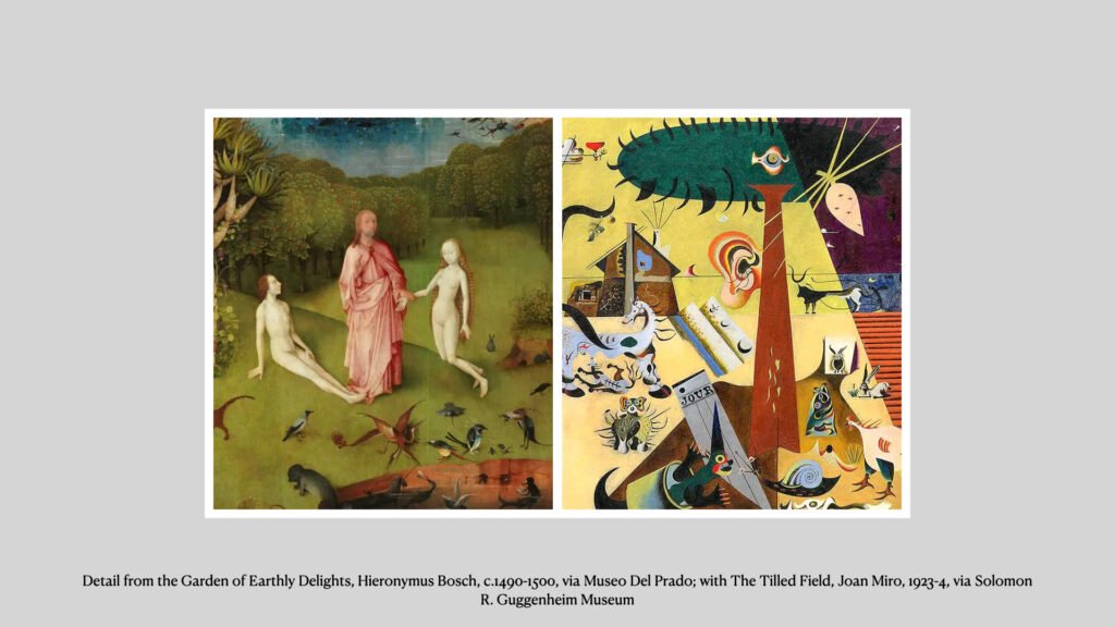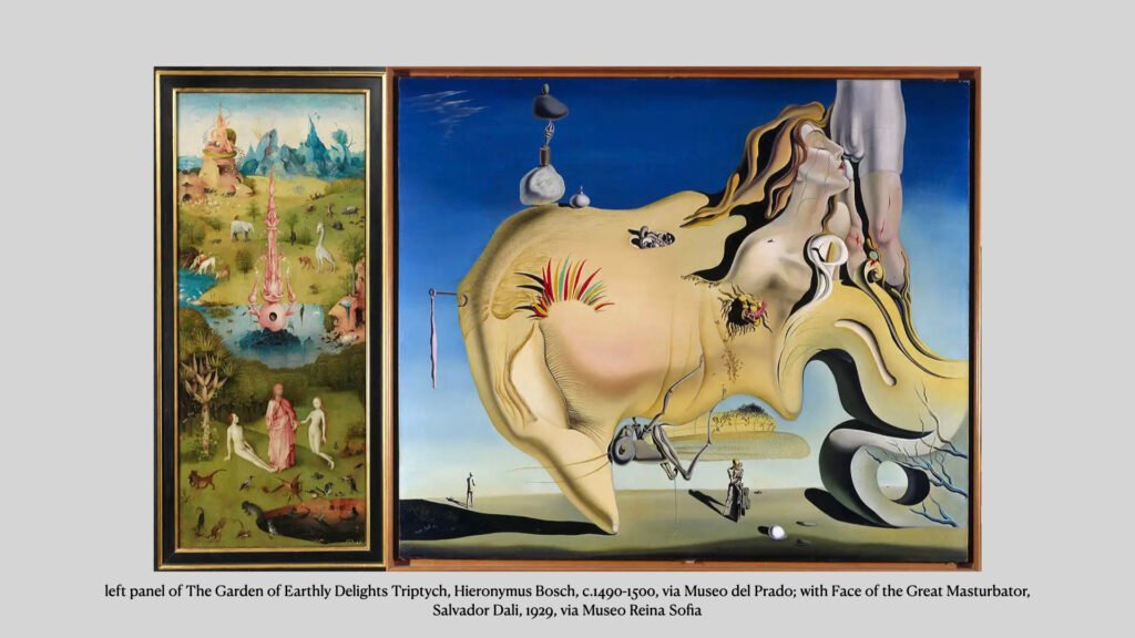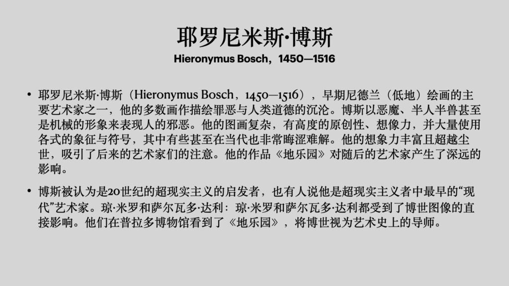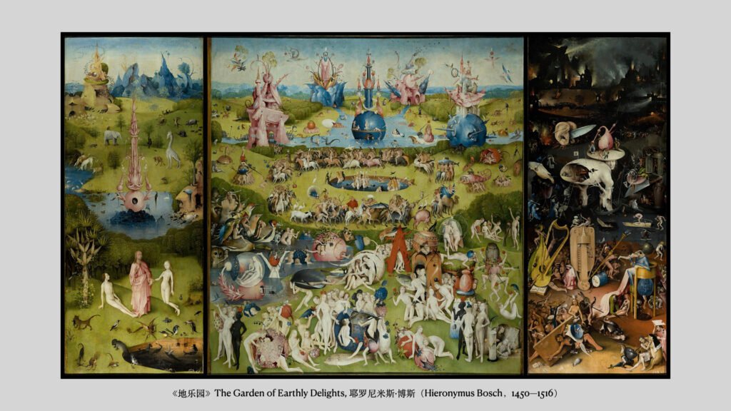 在艺术史中,人们常以“高地”与“低地”来区分文艺传统。文艺复兴时期,意大利的“高地”画家崇尚理性美学:和谐的比例、严谨的透视,以及理智塑造出的圣母与神祇形象被视为至高典范。他们的创作聚焦在完美的美学秩序上,而位于“低地”的尼德兰画派,虽然同样光芒夺目,却因题材贴近乡村生活、充满宗教寓言和奇幻想象,一度在正统美学体系中被边缘化。比如荷兰画家博斯(Hieronymus Bosch)以其满布恶魔、怪异机器和混沌乐园的画面,直面人性的贪婪与堕落,他的作品当时许多人甚至难以领悟其中象征意义。勃鲁盖尔(Pieter Bruegel)笔下的乡村狂欢与荒诞寓言,更是以朴素中见深意的手法,反映了世俗伦理与社会百态。传统理性美学只看重对称与秩序,容易忽略这些匠心独运的细节和想象的魔力。然而正是这股富饶的想象力,吸引了后世的目光:二十世纪的超现实主义大师们如达利、米罗曾亲赴普拉多博物馆,仔细观摩博斯的《地乐园》,并公开称博斯为艺术的导师,他们将梦境中的怪诞与无意识带入现实画布。