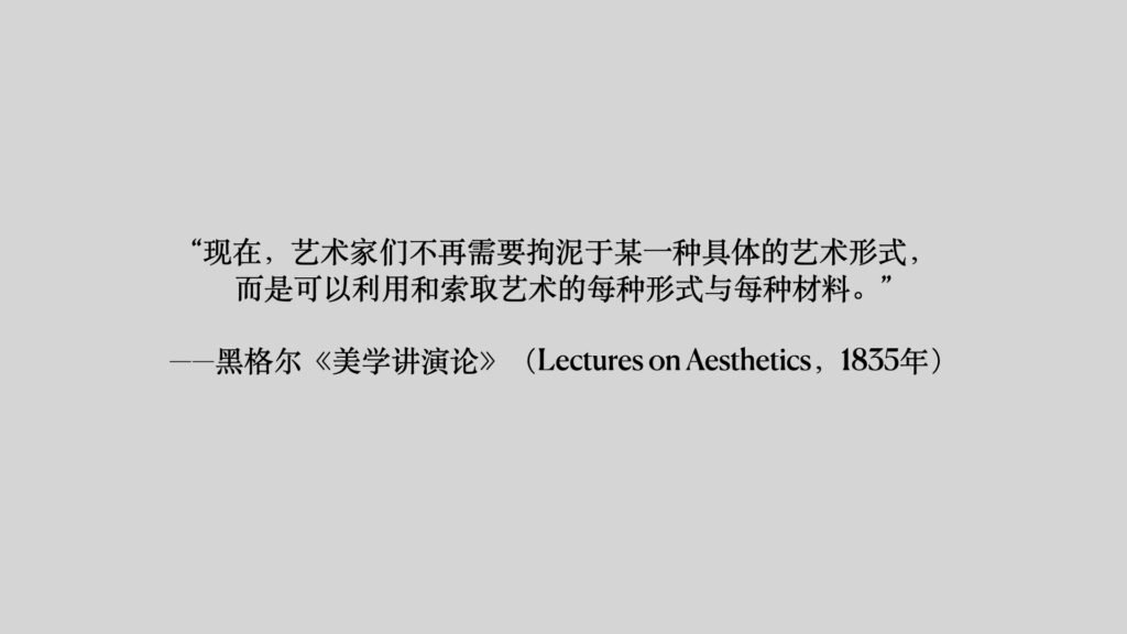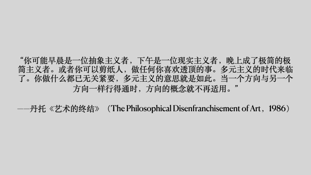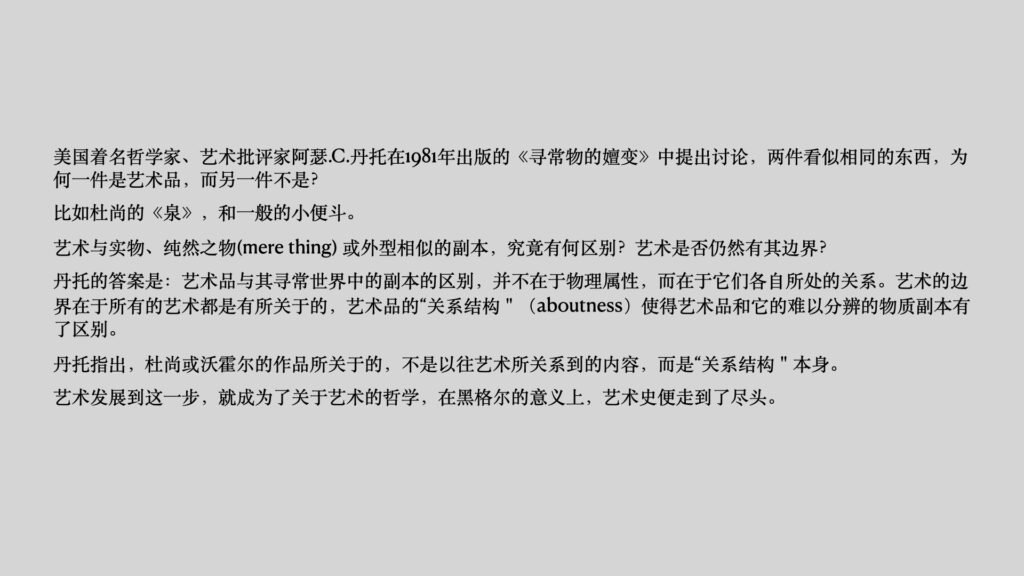在这样的语境中,我们不妨回头审视哲学家对“艺术终结”的论断。黑格尔早在十九世纪就认为,艺术曾经是人类精神表达的最高形式,但当理性哲学成熟后,艺术便完成了其历史使命——精神从通过艺术形式的符号化转向了自我阐释和思辨。简言之,艺术的“终结”并不意味着艺术消亡,而是艺术时代的灵性作用转入另一个平台;艺术的符号已经浸入思想之中,艺术自身的线性发展不再是主流。同样地,二十世纪的美国哲学家Arthur Danto也提出,“艺术终结”的概念:在现代艺术制度中,任何东西只要被艺术界赋予了意义,就成为了艺术,他用“情境”或“关系结构”来解释艺术作品的本质。他指出,艺术不再局限于物质的美学特征,而是一种置于语境和历史脉络中的整体——一个现象只有在与其它一切因素构成的“关系整体”中才能被理解。换言之,当一个物件或图像可以在博物馆里被称为艺术,那么后现代艺术史的故事线已经完结,因为它已不再遵循从古典到现代的美学演进逻辑。对丹托而言,正是在杜尚祭出小便池、沃霍尔展出《布里洛盒子》的那一刻,传统艺术史的线性演进逻辑走到了句点。艺术不再是风格的更替,而转向对‘什么是艺术’的元反思。
