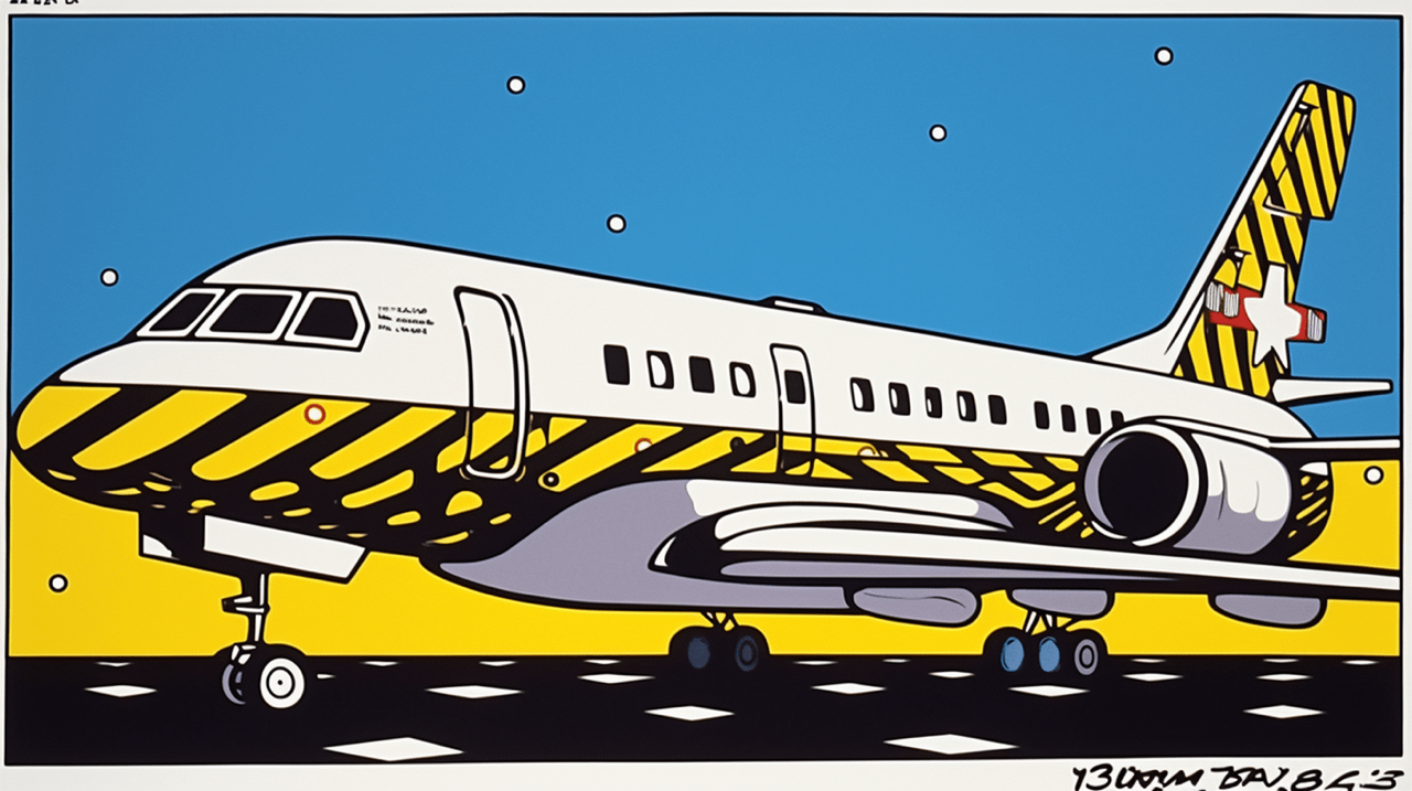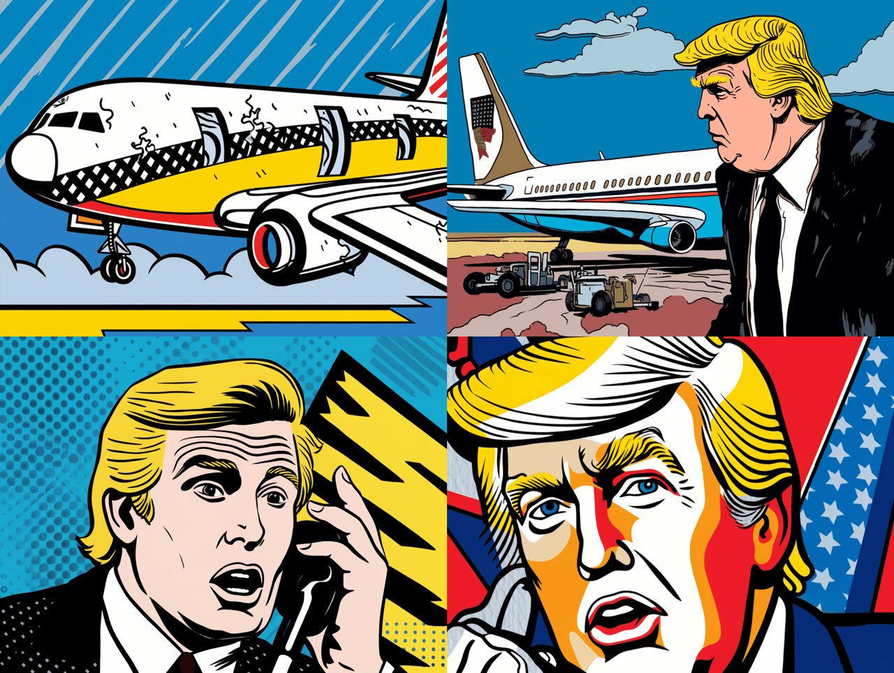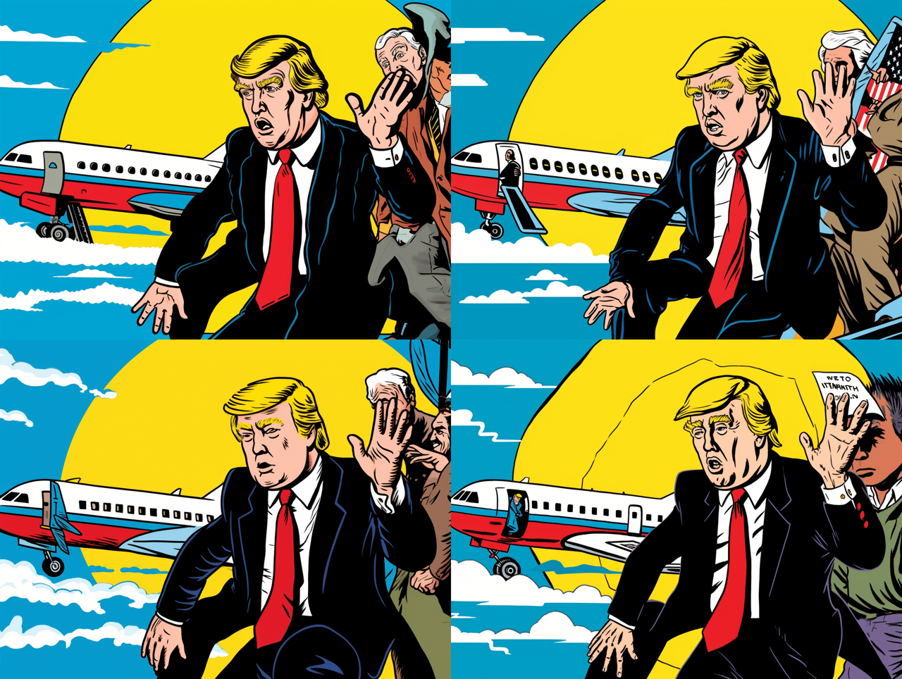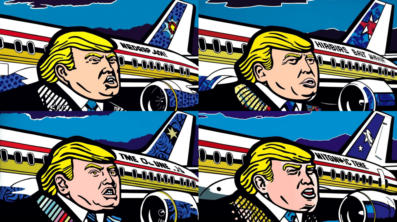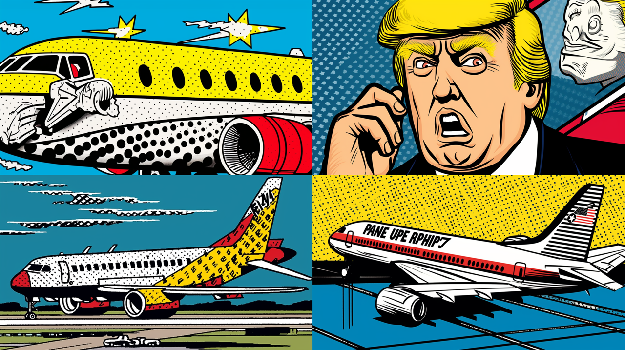 A pop-art prompt on Roy Lichtenstein’s work which simulates a piece of fake news that the Former President of the United States Donald Trump is about to board a private jet to Cuba to flee the United States as he was expected to appear in court on April 4th. to face felony charges following an investigation that spanned nearly five years.
