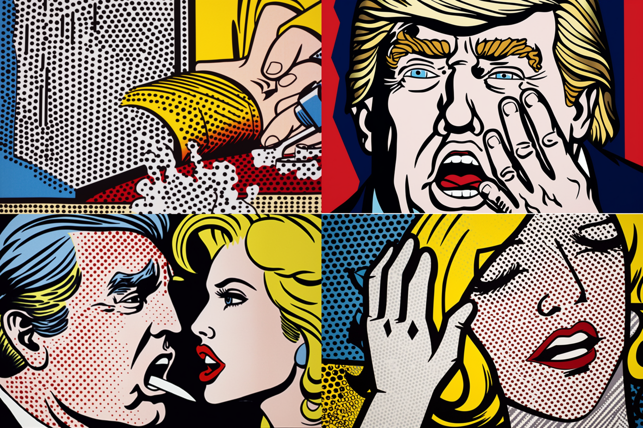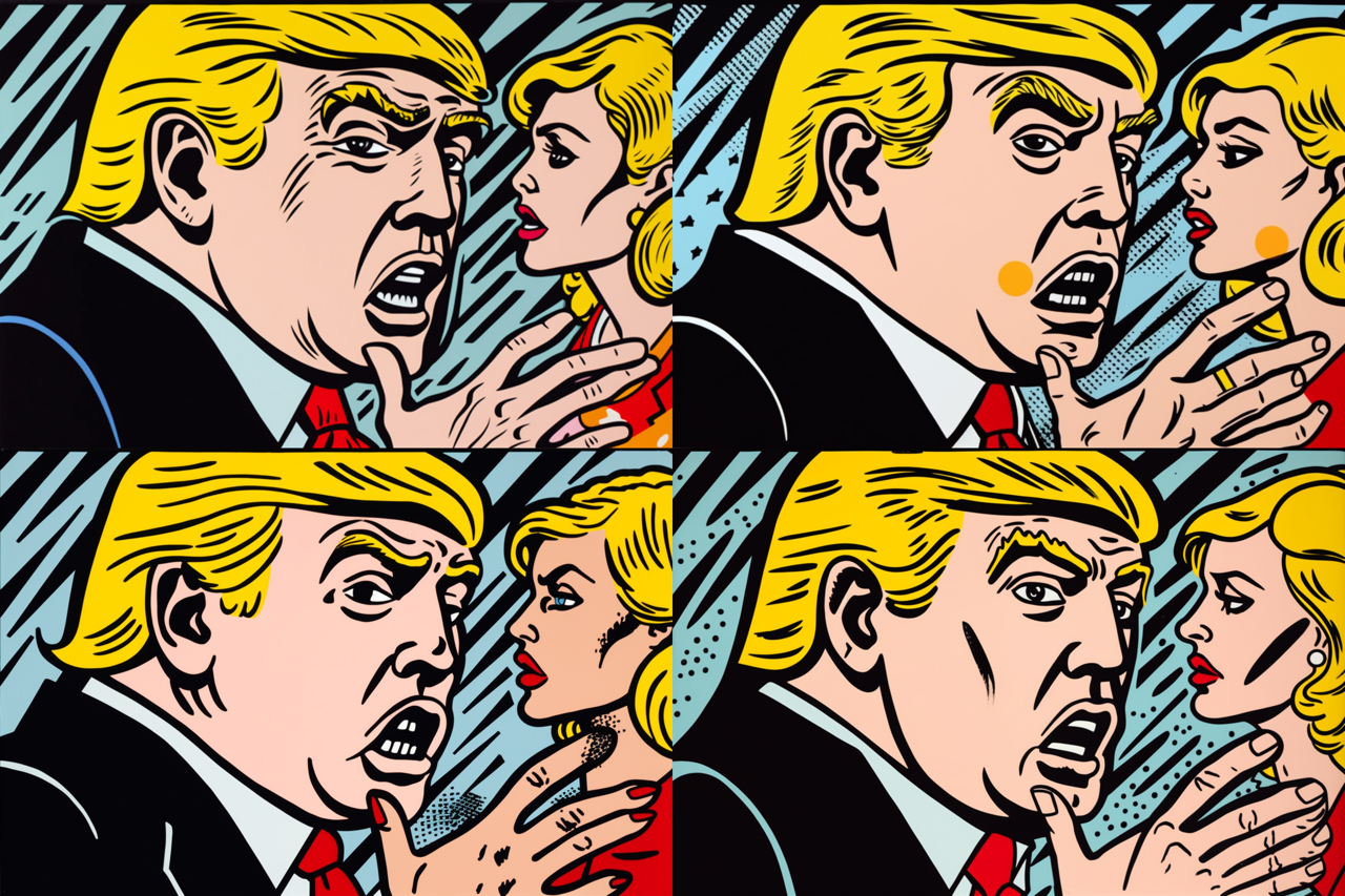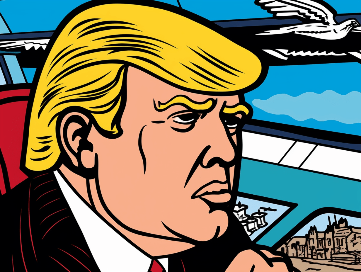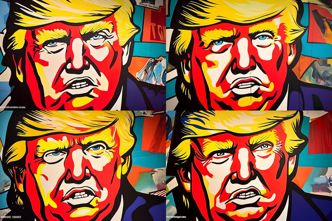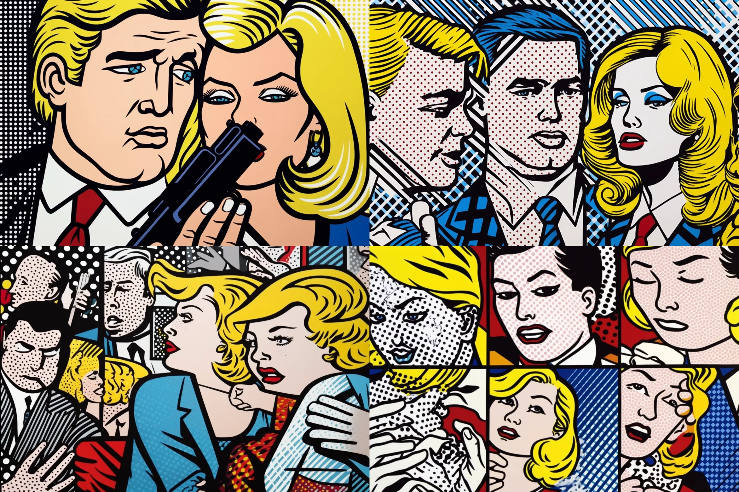 A pop-art prompt on Roy Lichtenstein’s work which simulates a piece of fake news that the Former President of the United States Donald Trump is about to board a private jet to Cuba to flee the United States as he was expected to appear in court on April 4th. to face felony charges following an investigation that spanned nearly five years.